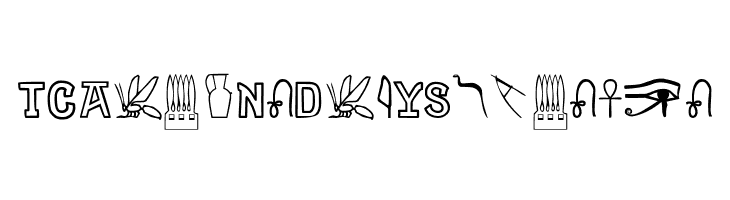 A bold, outlined font with geometric shapes and hieroglyphic elements.
