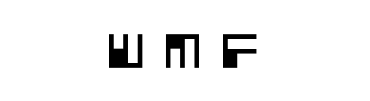 A futuristic, pixelated font with blocky, geometric shapes.